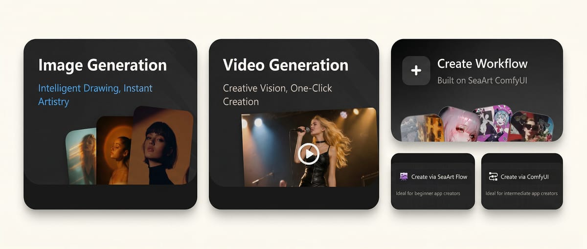 SeaArt has evolved into a full multi-modal creative platform. Think of it less like "an image generator" and more like "an AI creative hub with a model buffet." Here's what it covers in April 2026: