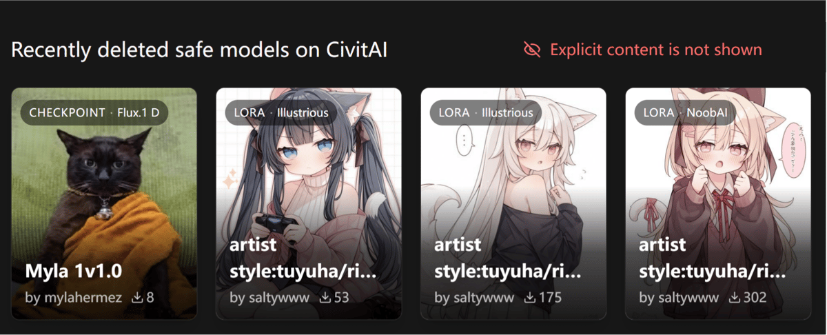 Le petit plus : Recherche par nom de modèle, hash SHA256, ou URL d'origine Civitai. Inclut un filtre « supprimé » pour cibler les contenus retirés.