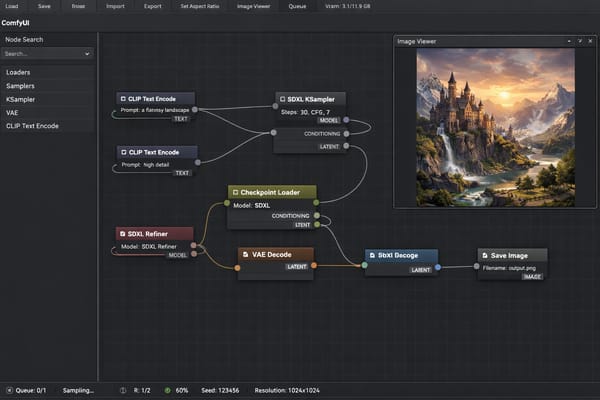ComfyUI (et ses alternatives comme Forge ou Fooocus) vous permet de faire tourner Stable Diffusion, Flux et d'autres modèles open source directement sur votre carte graphique. Pas de restrictions de plateforme, pas de crédits, pas de politique de contenu autre que votre propre jugement.
