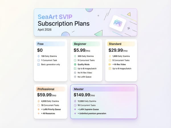 최종 업데이트: 2026년 4월. 이 리뷰는 공개된 요금제 데이터, 트러스트파일럿 사용자 보고서, 플랫폼 문서 및 실무 평가를 바탕으로 작성되었습니다. 저희는 SeaArt AI와 어떠한 제휴 관계도 맺고 있지 않습니다.