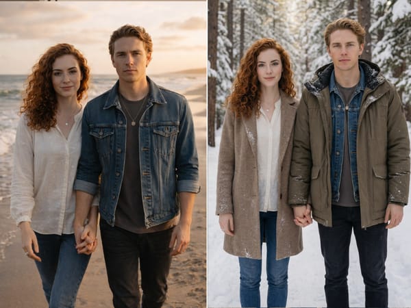 Living apart? Use our couple photo merge AI feature to visualize a life together. Combine two separate selfies into a "Reunion at the Airport" or "Dinner in Paris" scene.