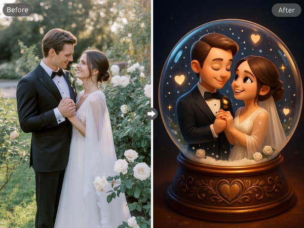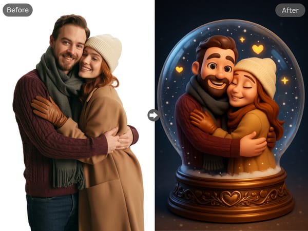 Gelişmiş yapay zekâ teknolojimiz, çiftleri orijinal arka plandan ayırıp kar küresinin içine kusursuzca yerleştiriyor. Böylece, kenarlar temiz ve doğal görünüyor, çiftin cam kürenin içinde gerçekten varmış gibi hissediyorsunuz. Dikkat dağıtan efektler veya kötü maskeleme gibi sorunlarla karşılaşmıyorsunuz.